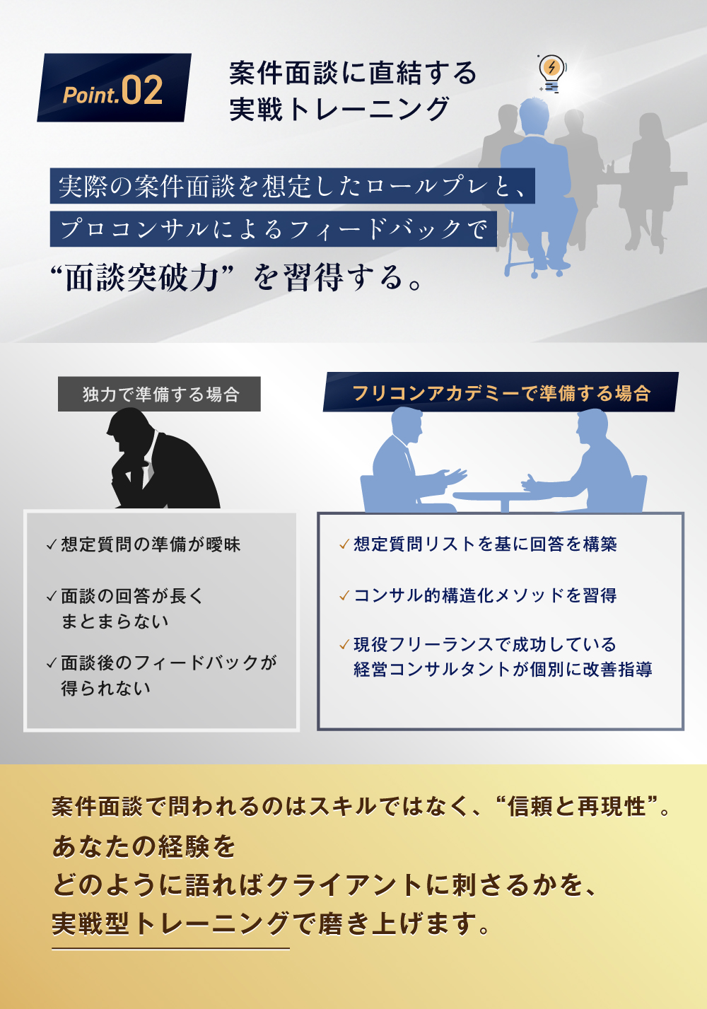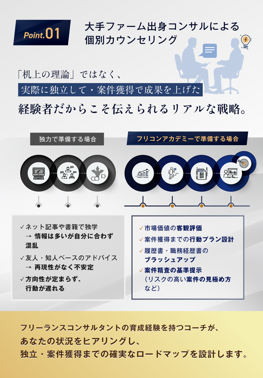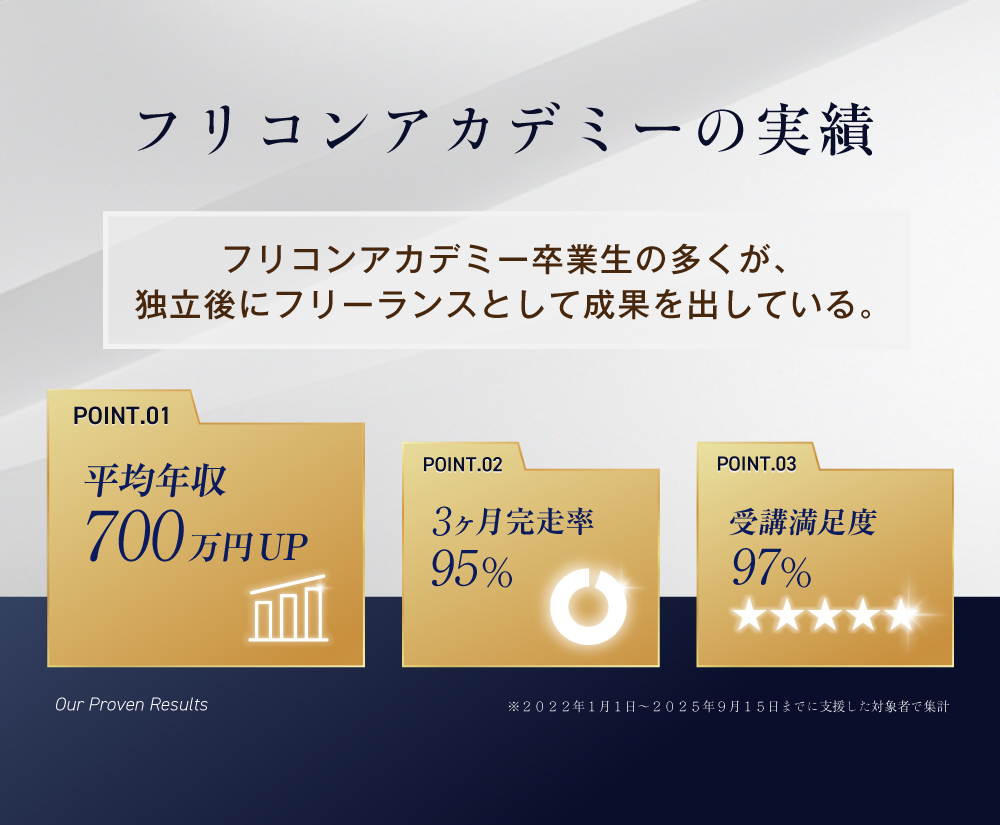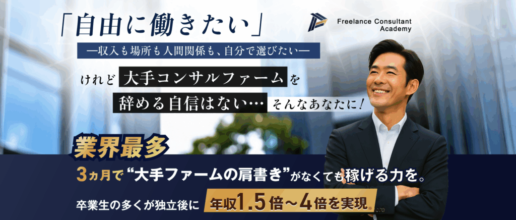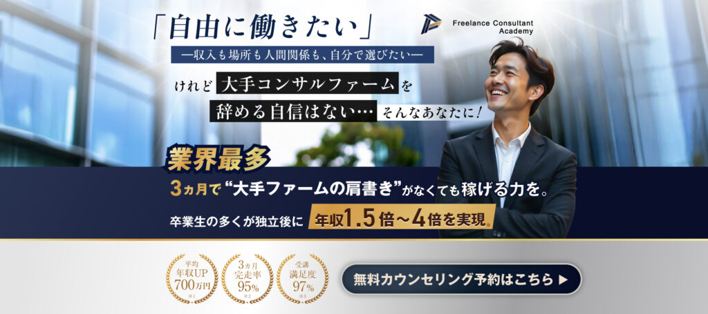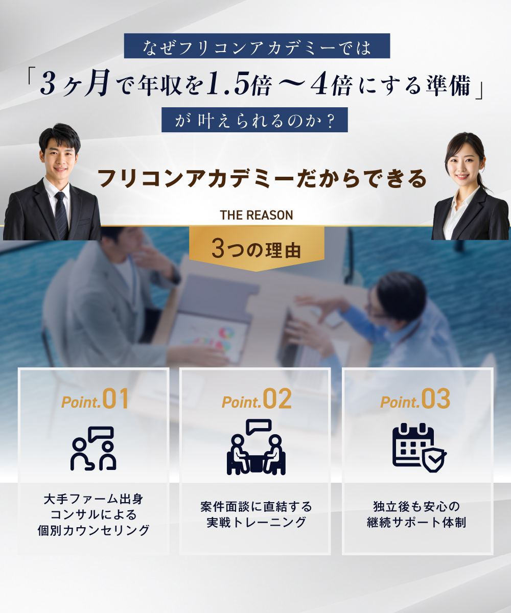「大手ファームでは仕事があるのに、独立したら仕事がない」という状況に直面する人が多い中、フリコンアカデミーでは「独立後に通用するためのマインドとスキル」を体系化。